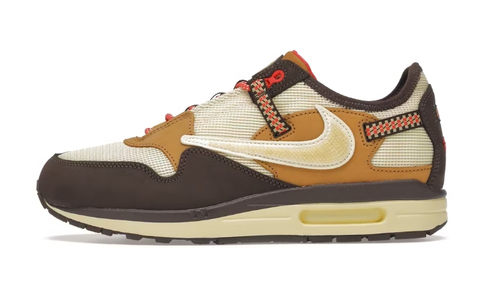 In collaborazione con l’etichetta discografica di Travis Scott, Cactus Jack, le Nike Air Max 1 Travis Scott Cactus Jack Brown si ispirano alle scarpe da trekking Nike ACG Pocket Knife. Hanno una tomaia in mesh a strati con rivestimenti in Durabuck tono su tono e loghi Swoosh invertiti. Il sistema di allacciatura Gillie richiama le trail runners. La suola Air completa il capolavoro.