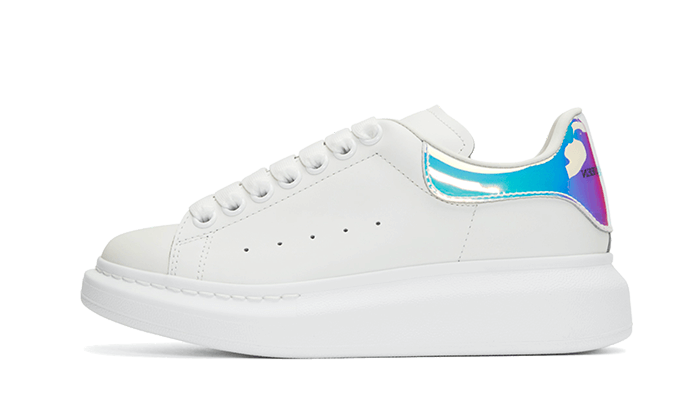 La Alexander McQueen Oversized Holographique se compose d’une empeigne en cuir premium blanc. On retrouve évidemment la semelle oversize qui a fait la renommée du modèle. Les lacets plats et les oeillets suivent la tendance blanche de la silhouette. Le talon vient contraster le tout avec une matière holographique qui apporte une touche futuriste à cette McQueen.